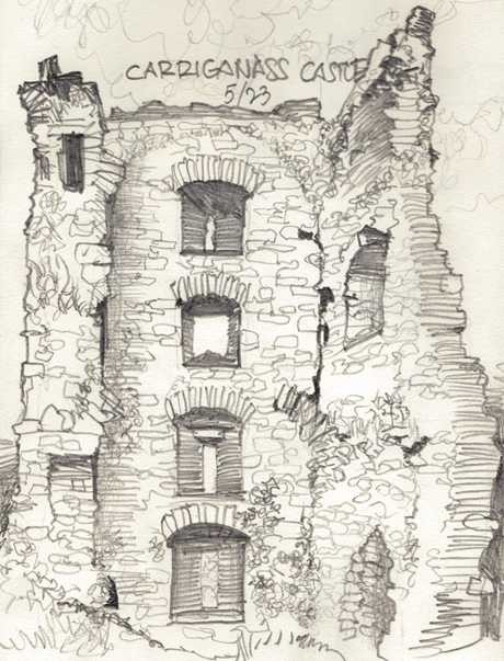 Ireland is where my love of castle illustration kicked off, in 2014 I began with just on-site fast sketching. Thus all this work on this page is of Irish ruins. Carriganass is an attractive ruin but presented more as a display, very look don't touch.