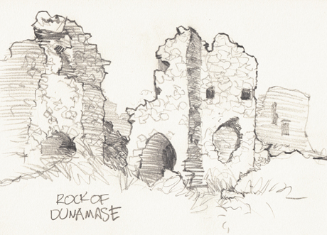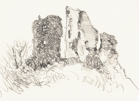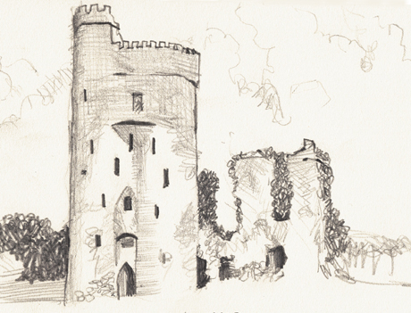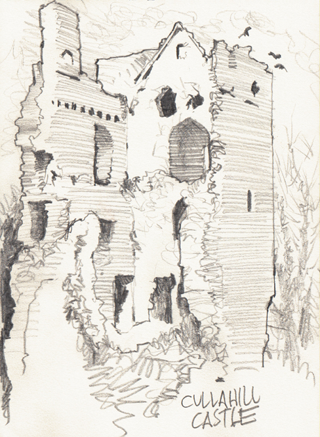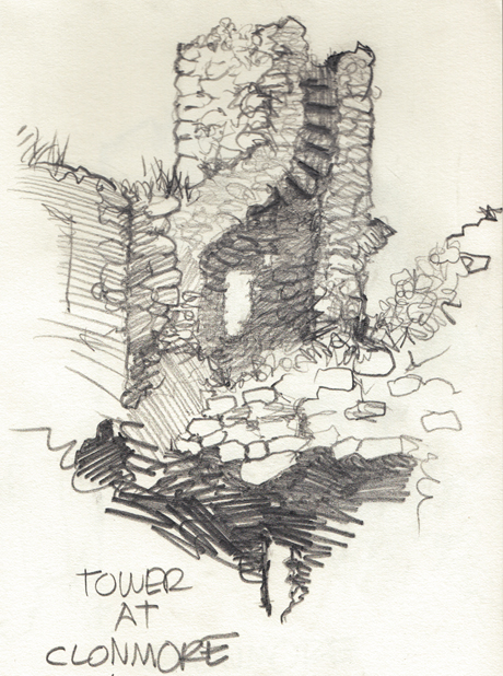 Ireland is where my love of castle illustration kicked off, in 2014 I began with just on-site fast sketching. Thus all this work on this page is of Irish ruins. Carriganass is an attractive ruin but presented more as a display, very look don't touch.